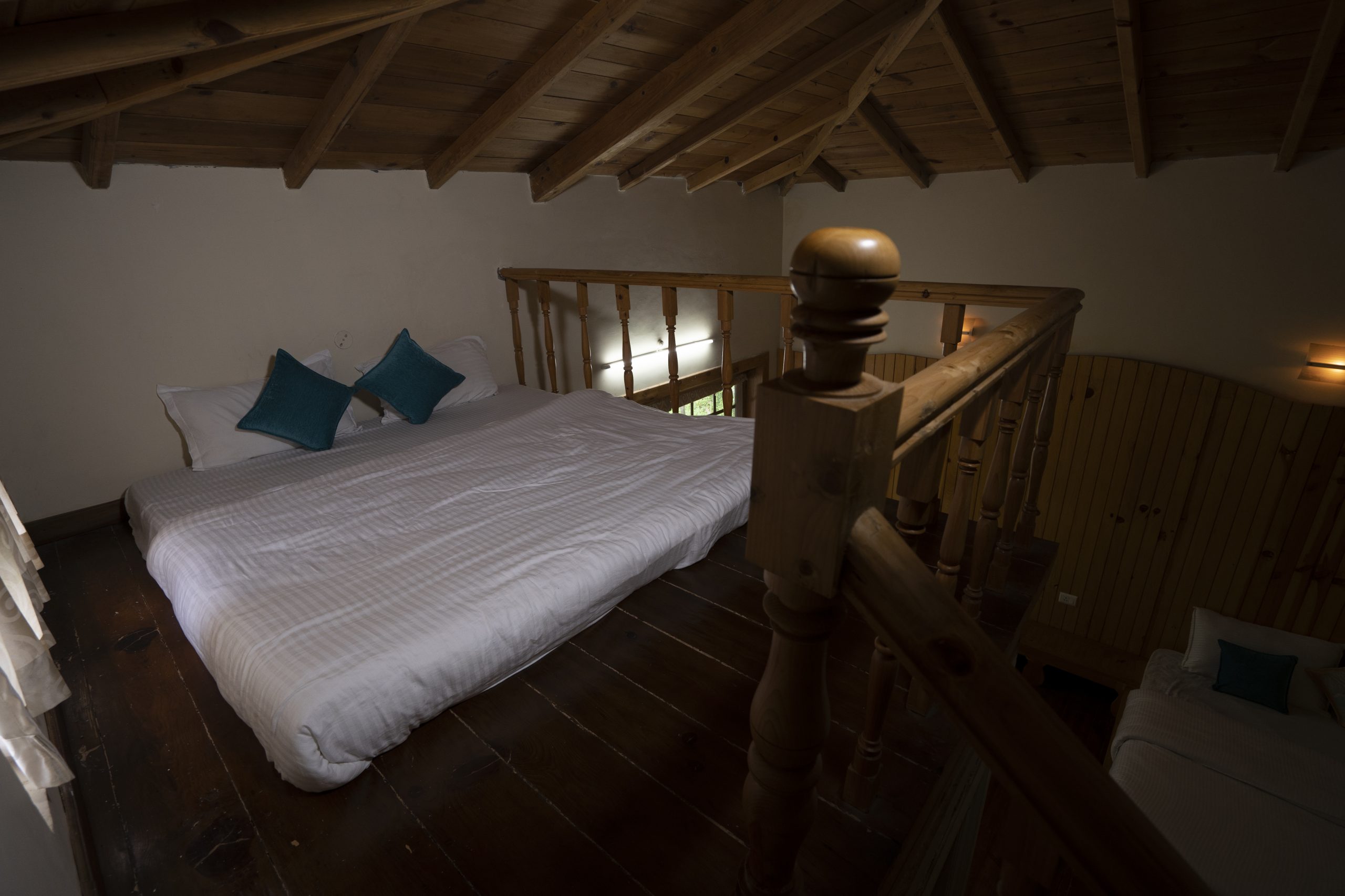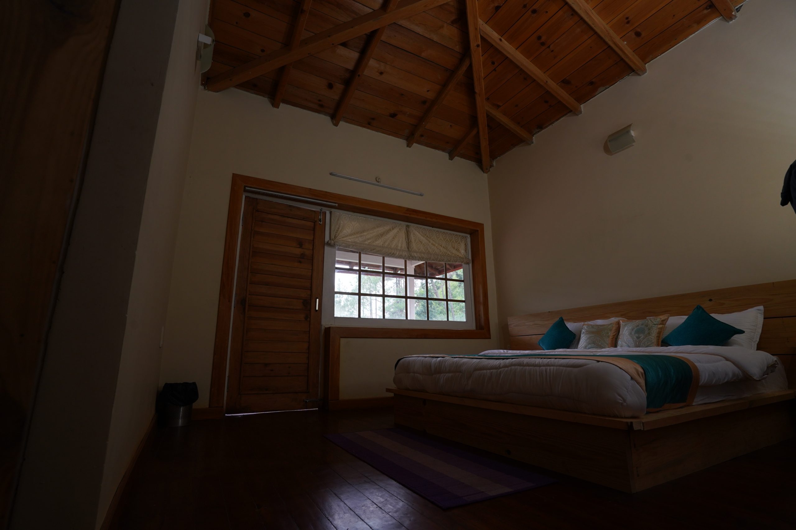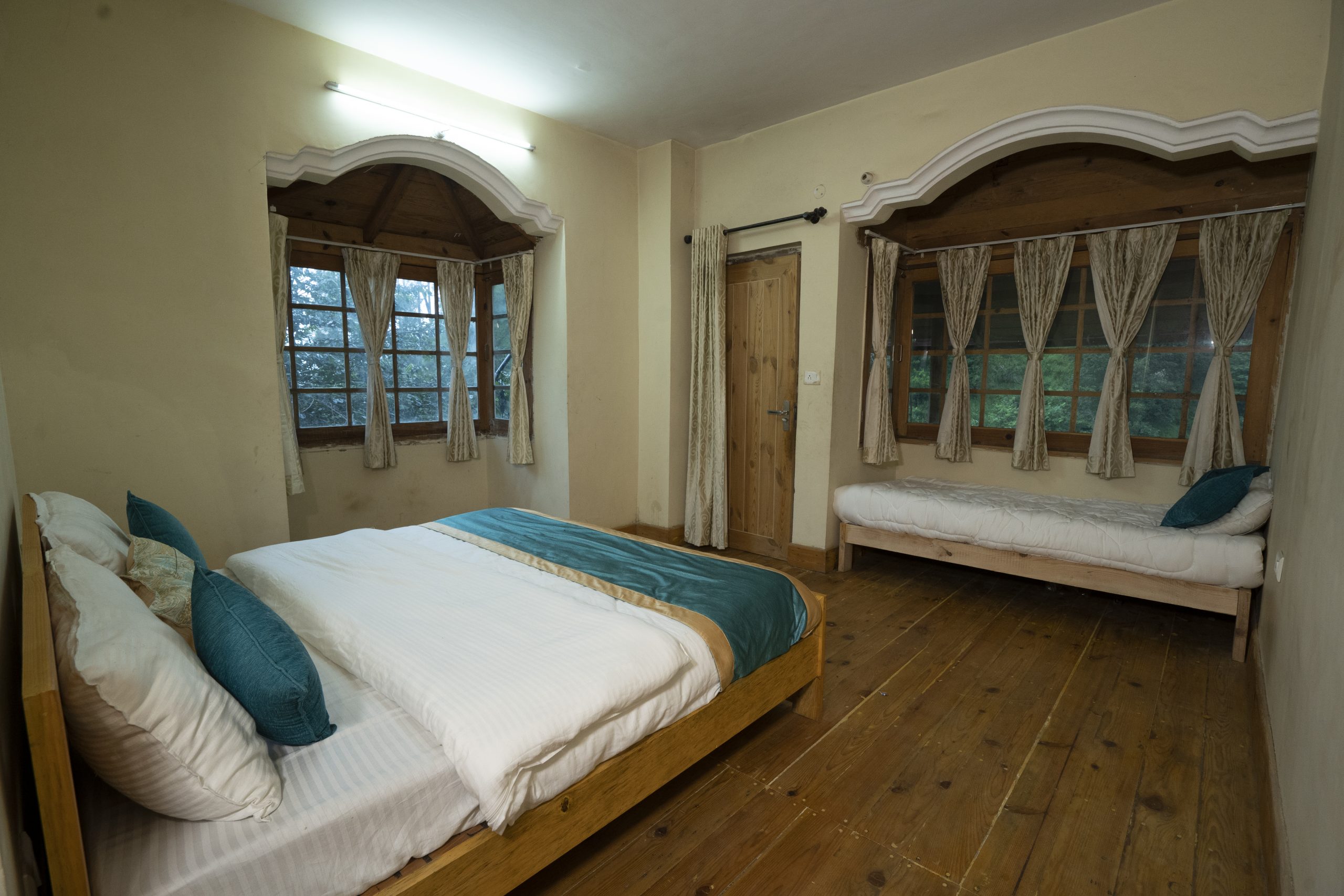 Tastefully decorated, each room is furnished with a king size bed, wooden flooring, dresser, LED TV, well lit bathroom, shower and full length bath tub. From the windows and the small balcony of the room, guests can enjoy uninterrupted panoramas of the dramatic Ramgarh valley cloaked in evergreen cedar trees.